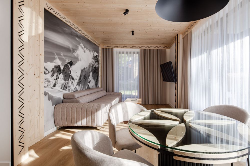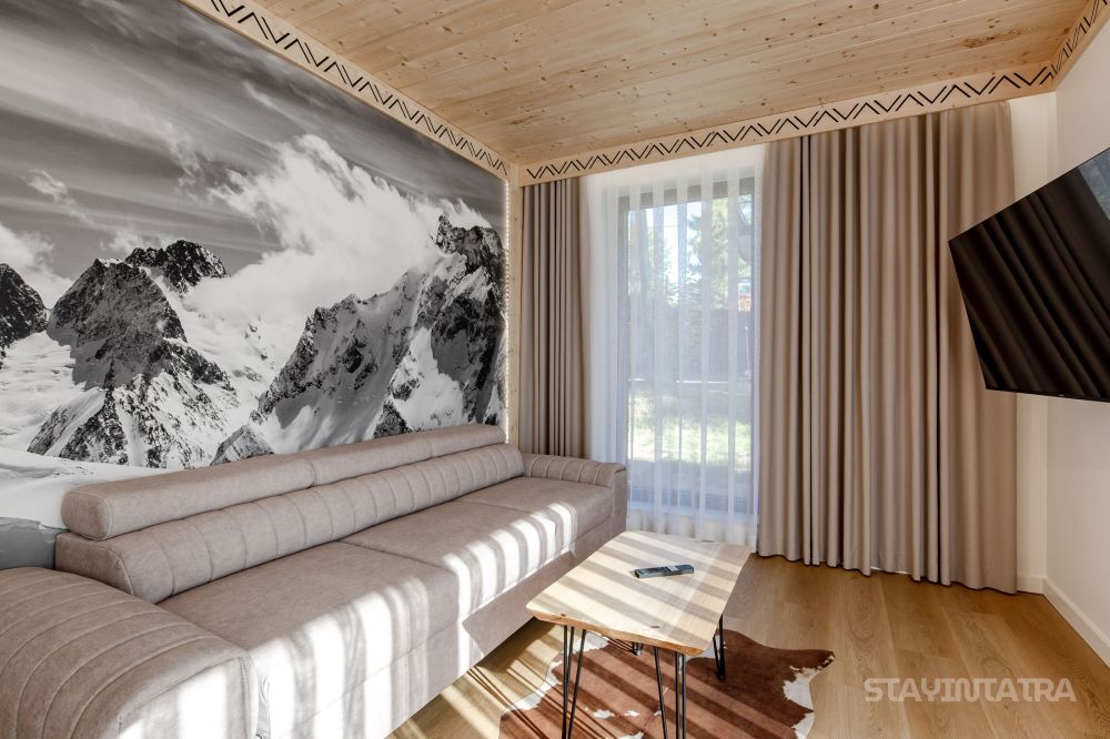 Salon: rozkładana sofa, stolik kawowy, telewizor, szafa, klimatyzacja