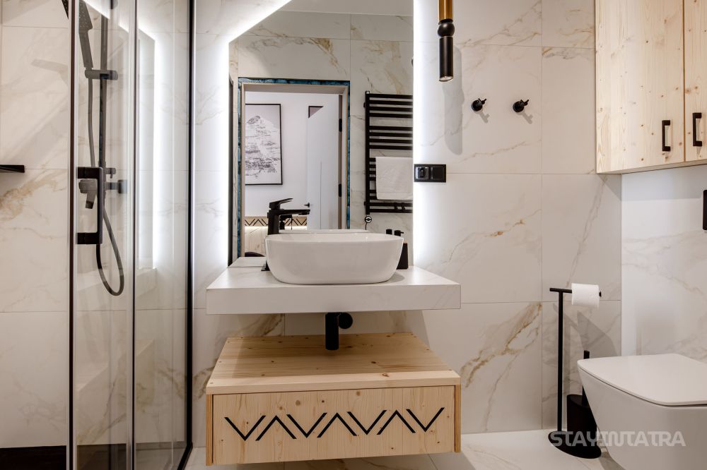 Łazienka: kabina prysznicowa, toaleta, umywalka, lustro, duża szuflada, szafka, suszarka do włosów
