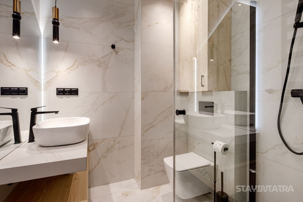 Łazienka: kabina prysznicowa, toaleta, umywalka, lustro, duża szuflada, suszarka do włosów