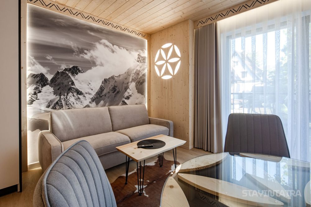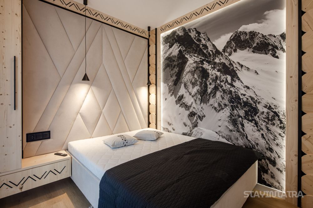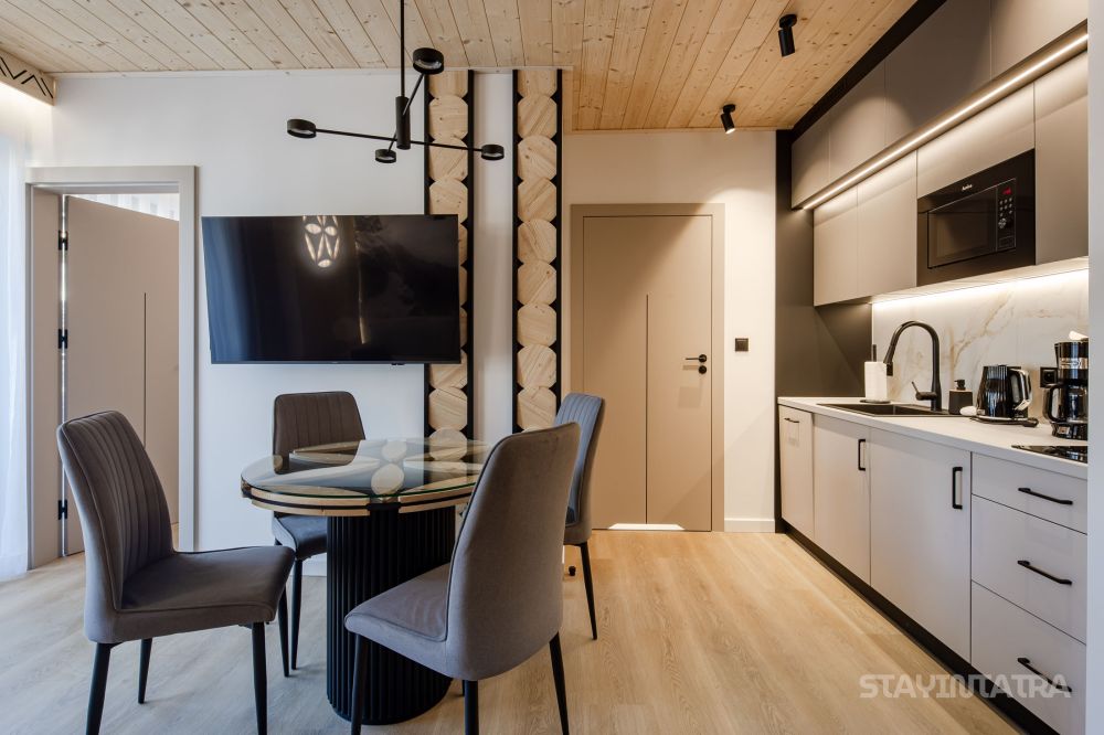 Struktura Apartamentu: salon z aneksem kuchennym z wyjściem na balkon z meblami ogrodowymi: stolik i dwa krzesła widok na Tatry fragment pomiędzy domami, zamykana sypialnia z wyjściem na balkon, łazienka