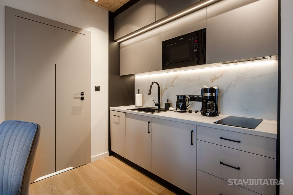 Aneks kuchenny: dwupalnikowa płyta indukcyjna, lodówka, zmywarka, mikrofalówka, czajnik elektryczny, ekspres do kawy DeLonghi przelewowy, zastawa ceramiczna oraz szklana, sztućce, garnki, patelnie, akcesoria do gotowania, stół i krzesła