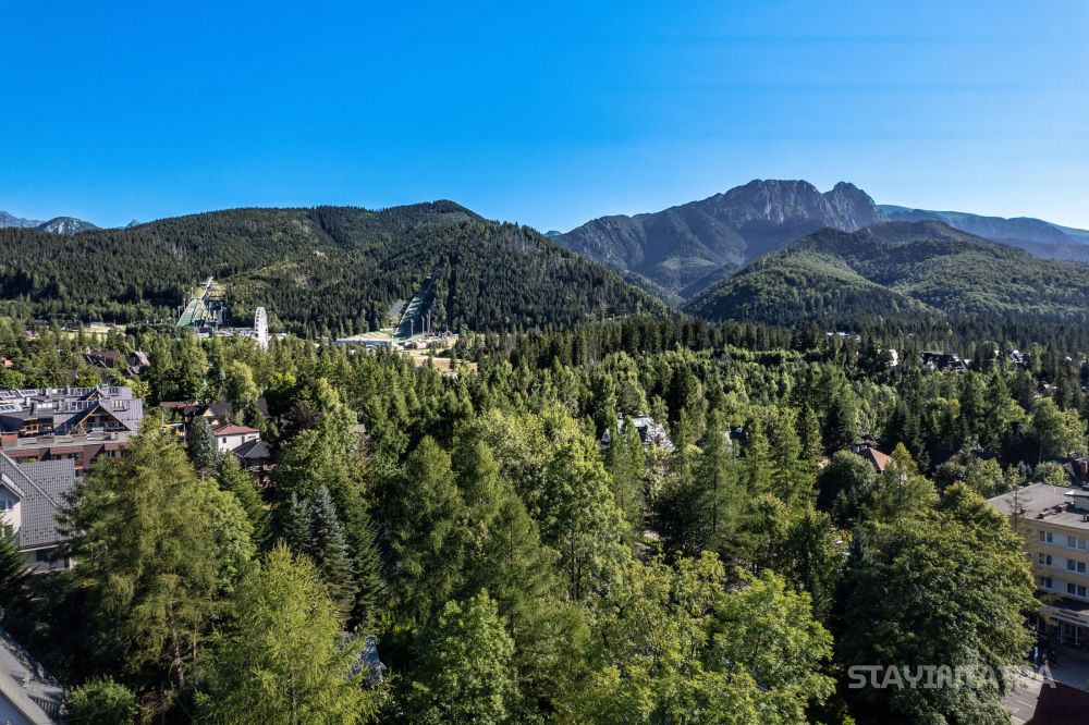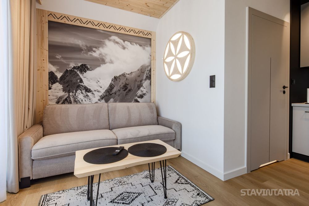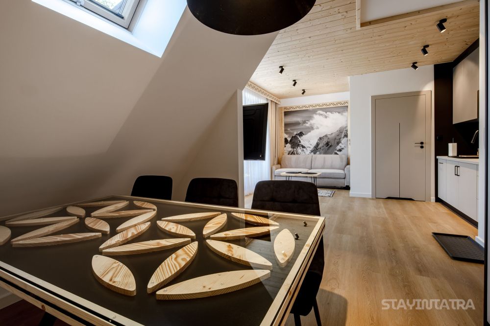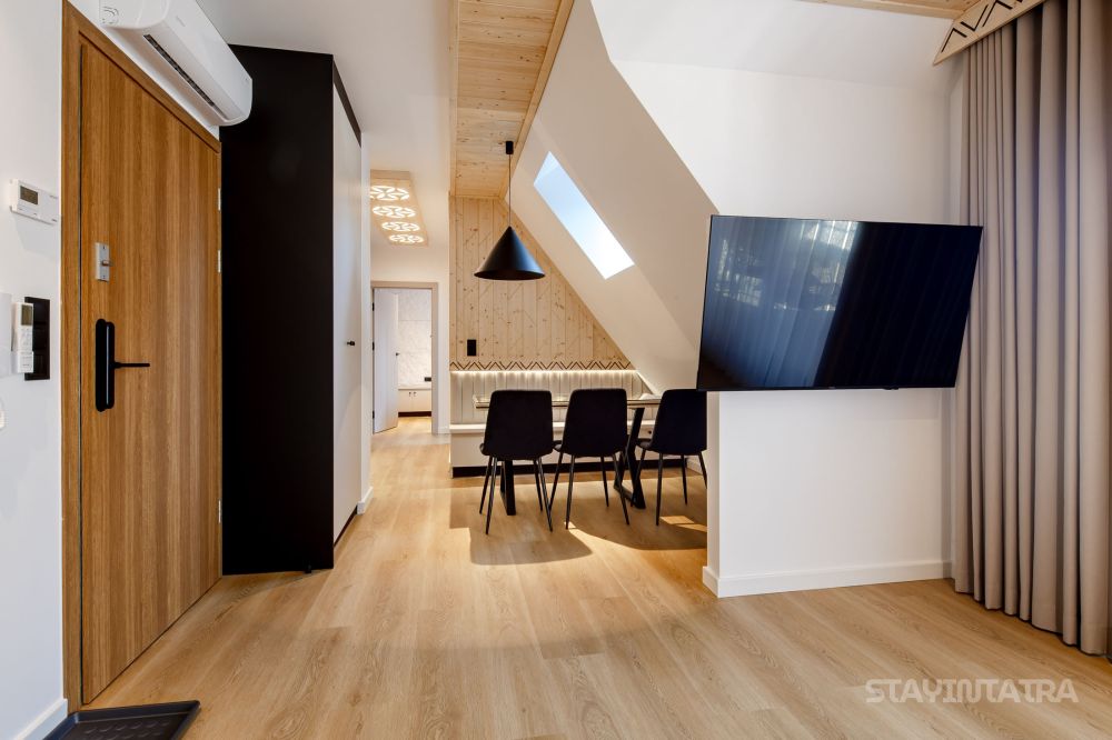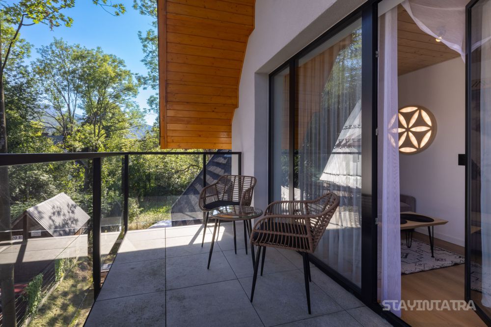 Struktura Apartamentu: salon z aneksem kuchennym z wyjściem na balkon z meblami ogrodowymi: stolik i dwa krzesła, widok na Tatry przysłonięty drzewami pomiędzy budynkami, dwie zamykane sypialnie, łazienka