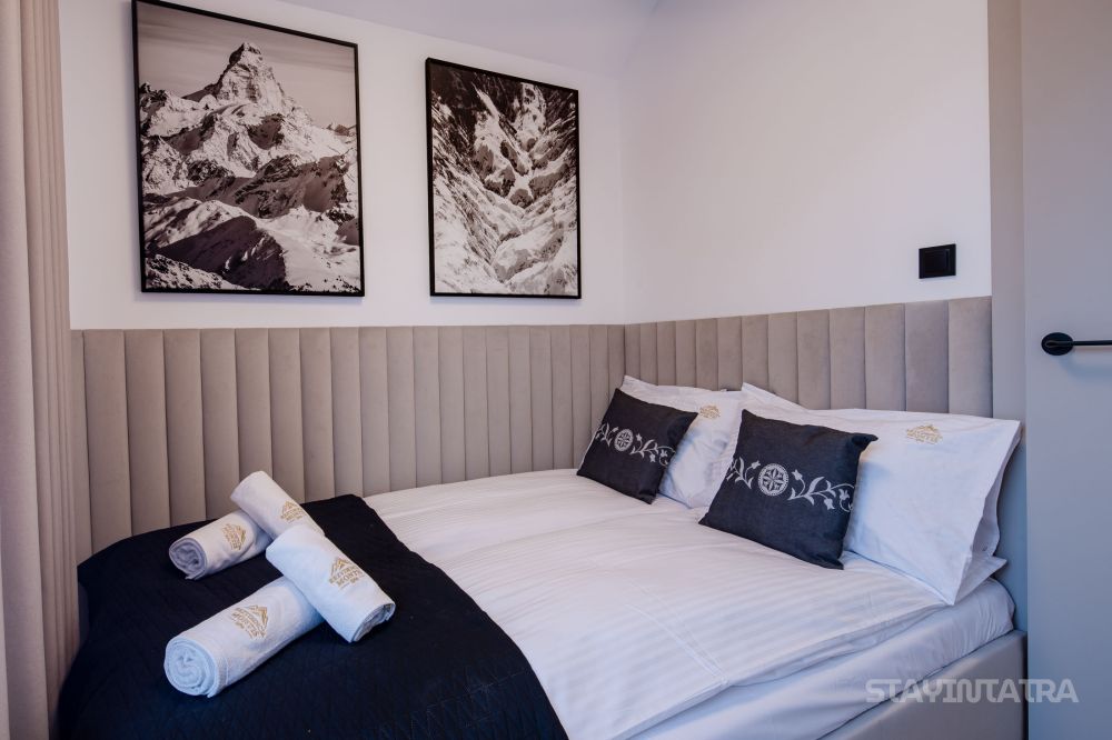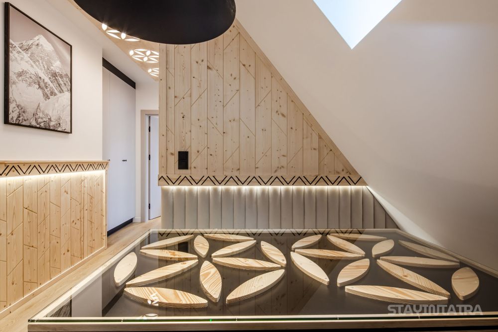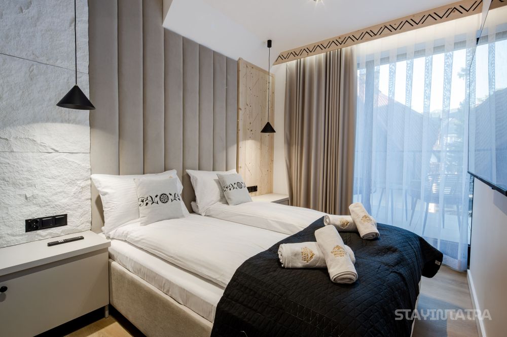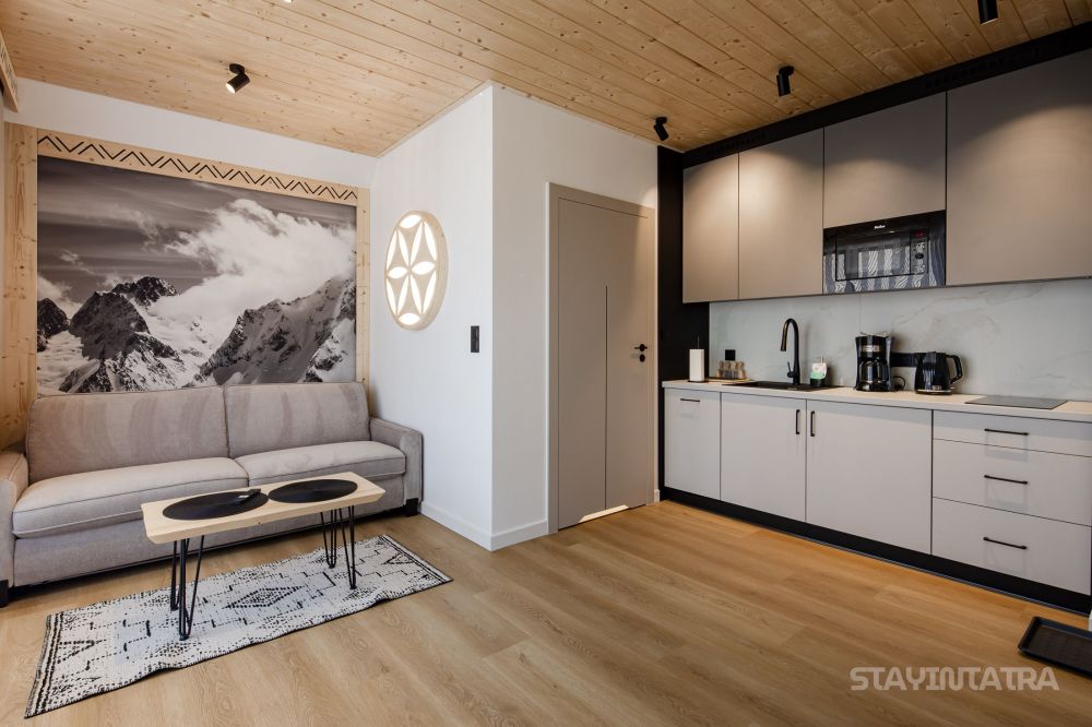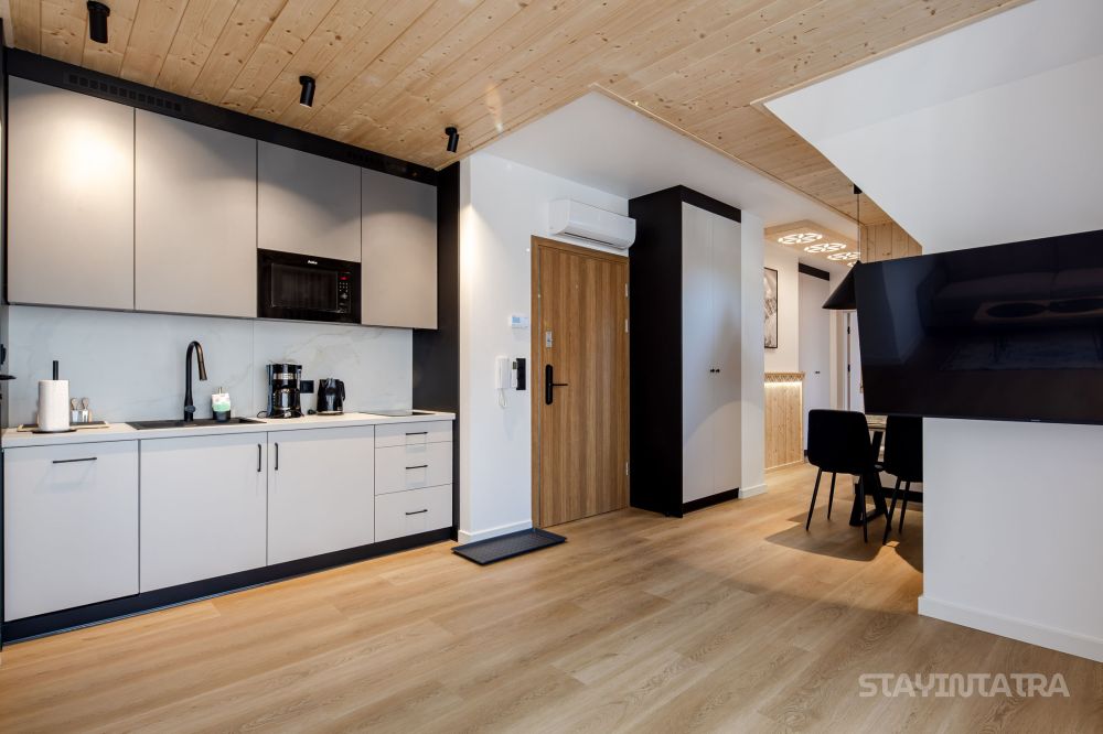 Struktura Apartamentu: salon z aneksem kuchennym z wyjściem na balkon z meblami ogrodowymi: stolik i dwa krzesła, widok na Tatry przysłonięty drzewami pomiędzy budynkami, dwie zamykane sypialnie, łazienka
