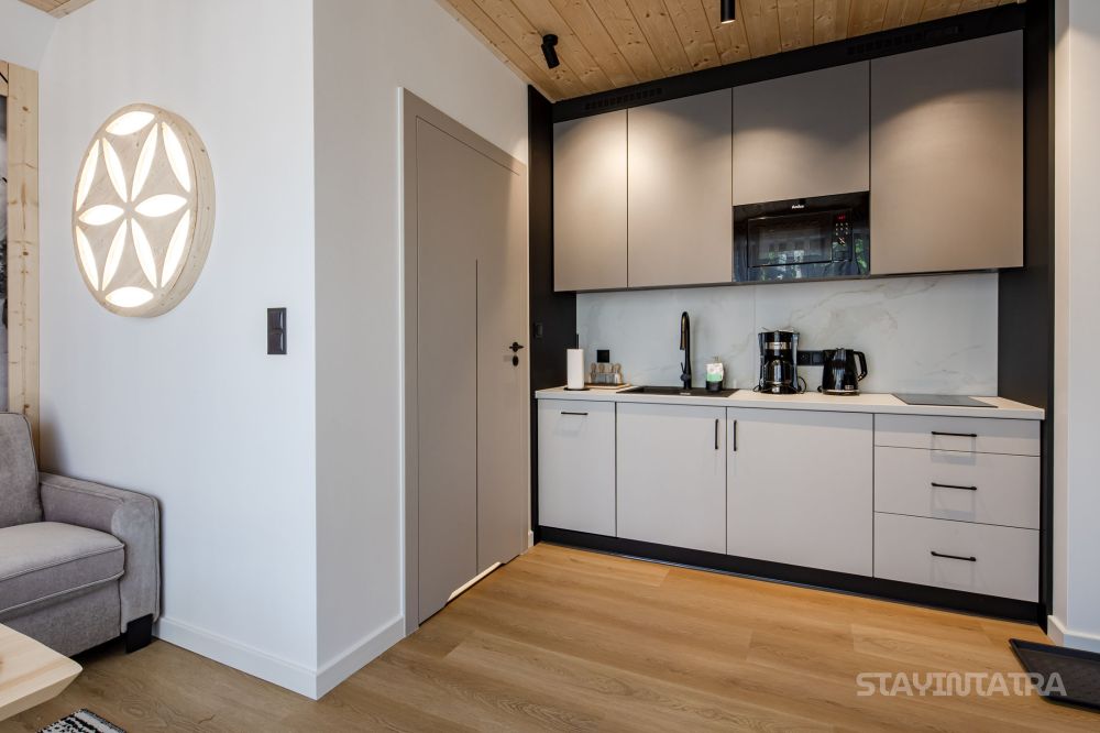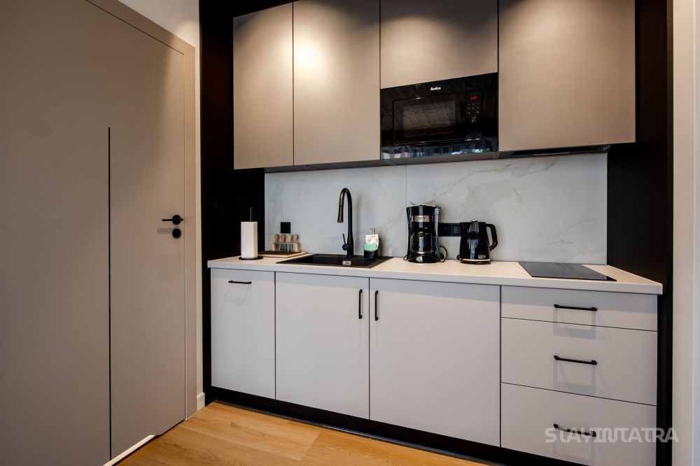 Aneks kuchenny: dwupalnikowa płyta indukcyjna, lodówka, zmywarka, mikrofalówka, czajnik elektryczny, ekspres do kawy DeLonghi przelewowy, zastawa ceramiczna oraz szklana, sztućce, garnki, patelnie, akcesoria do gotowania, stół, 3 krzesła oraz ławka do siedzenia z szafkami
