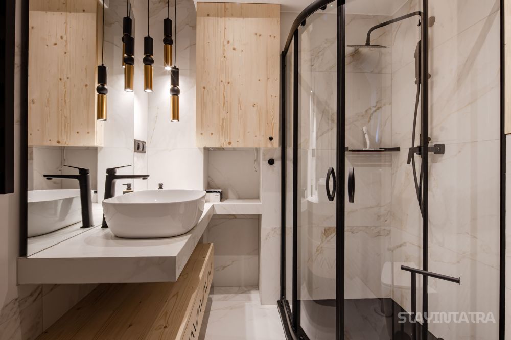 Łazienka: kabina prysznicowa, toaleta, umywalka, lustro, duża szuflada, szafka, suszarka do włosów